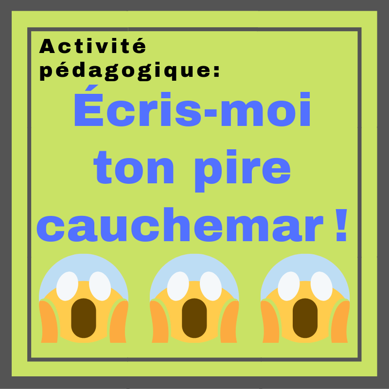 Résumé : Les apprenants écrivent une histoire qui décrit la situation qui serait la plus angoissante et épouvante pour eux, autrement dit : leur pire cauchemar ! Cette activité pourrait prendre plusieurs périodes ; vous pouvez la faire un peu comme un atelier d’écriture.