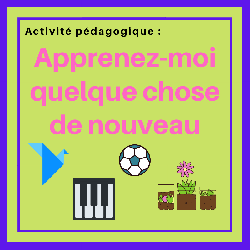Chaque apprenant choisit une activité qu’il maitrise (au moins un peu). Des exemples : un instrument, un sport, un jeu de société, l’origami, une recette, le tricot, le jardinage, la méditation, etc. Chacun doit avoir une activité différente.